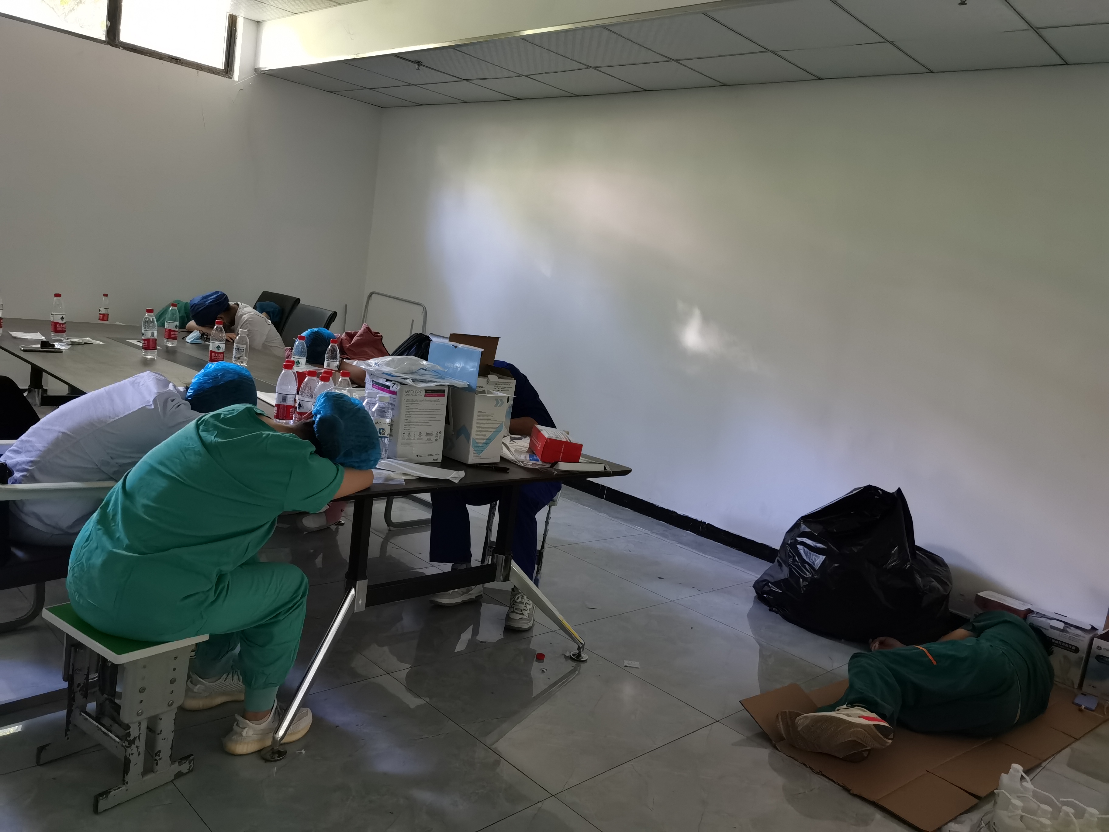 休息不足加上高强度核酸检测工作,第一天中午轮休时,许多医护工作者趴在桌子上,甚至直接躺在地上短暂休息。“看见他们中有人直接躺在地上休息,我很心疼,同时又很敬佩他们的付出。”申月平说。