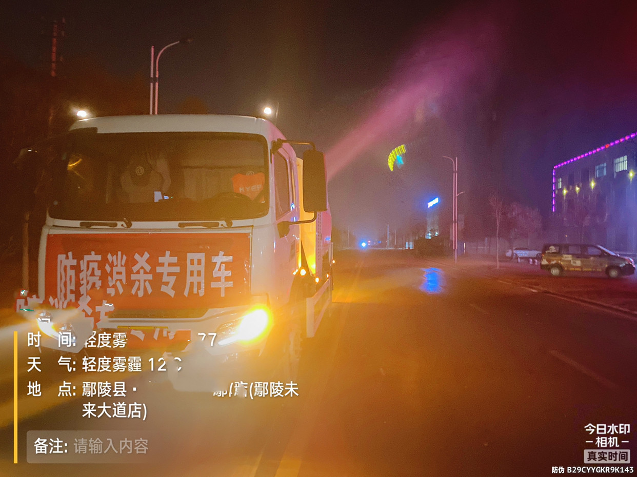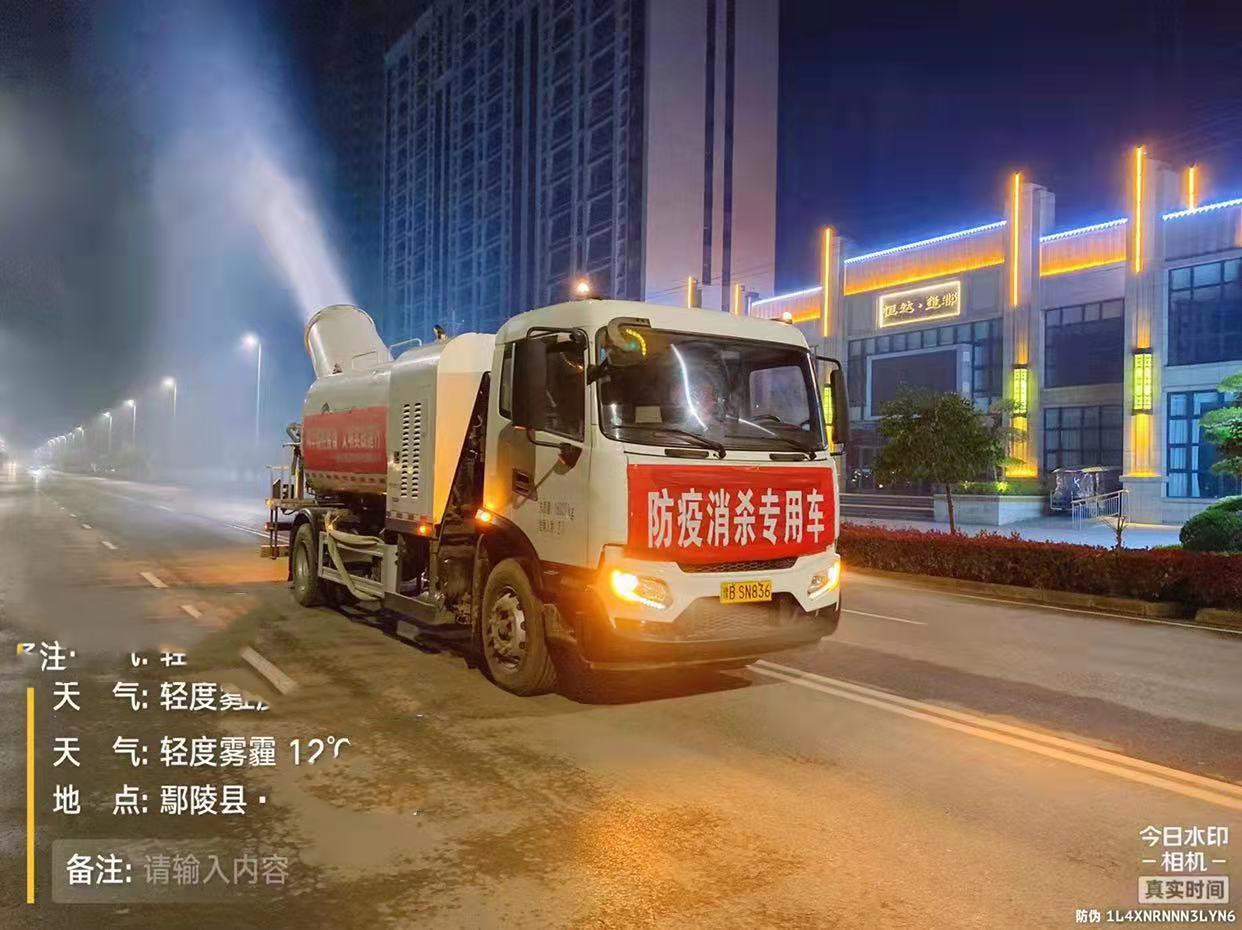 利用5台雾炮车、24台洒水车、5台道路养护车、7台三轮冲洗车每晚9点利用市民休息时间进行消杀作业。共出动607车次、人员3161余人次、喷洒含氯消毒液、84消毒液38.3吨、84消毒片6万片。