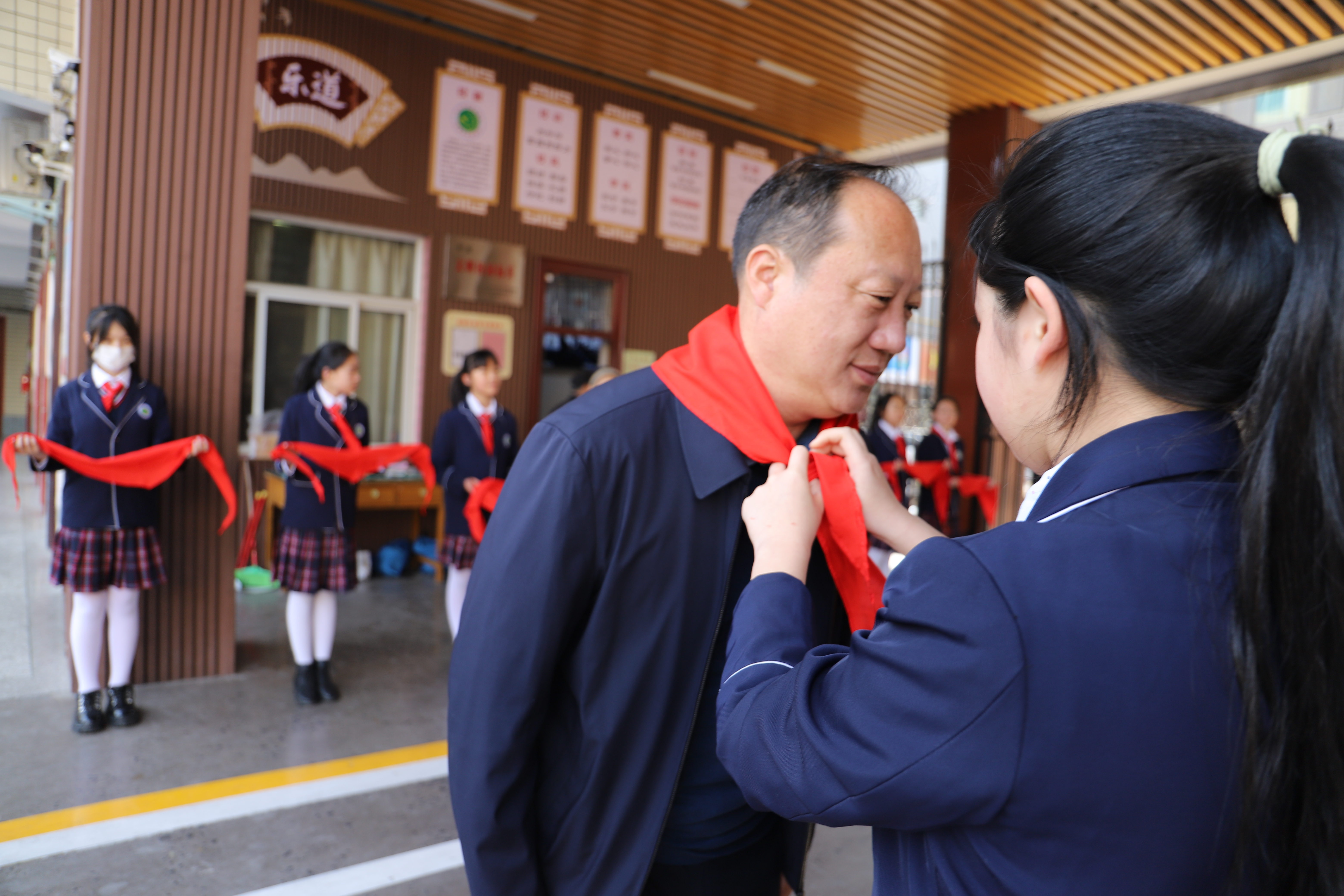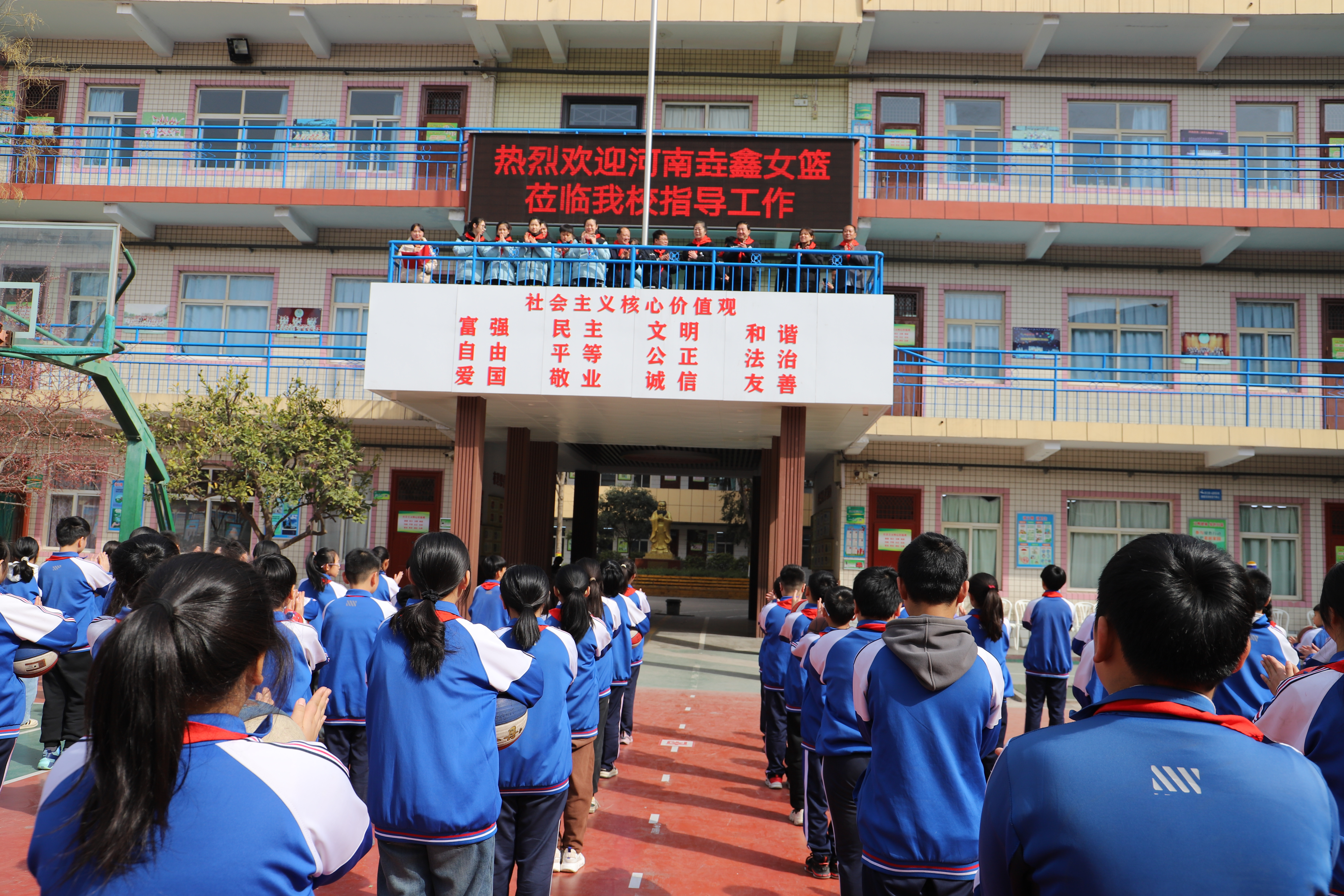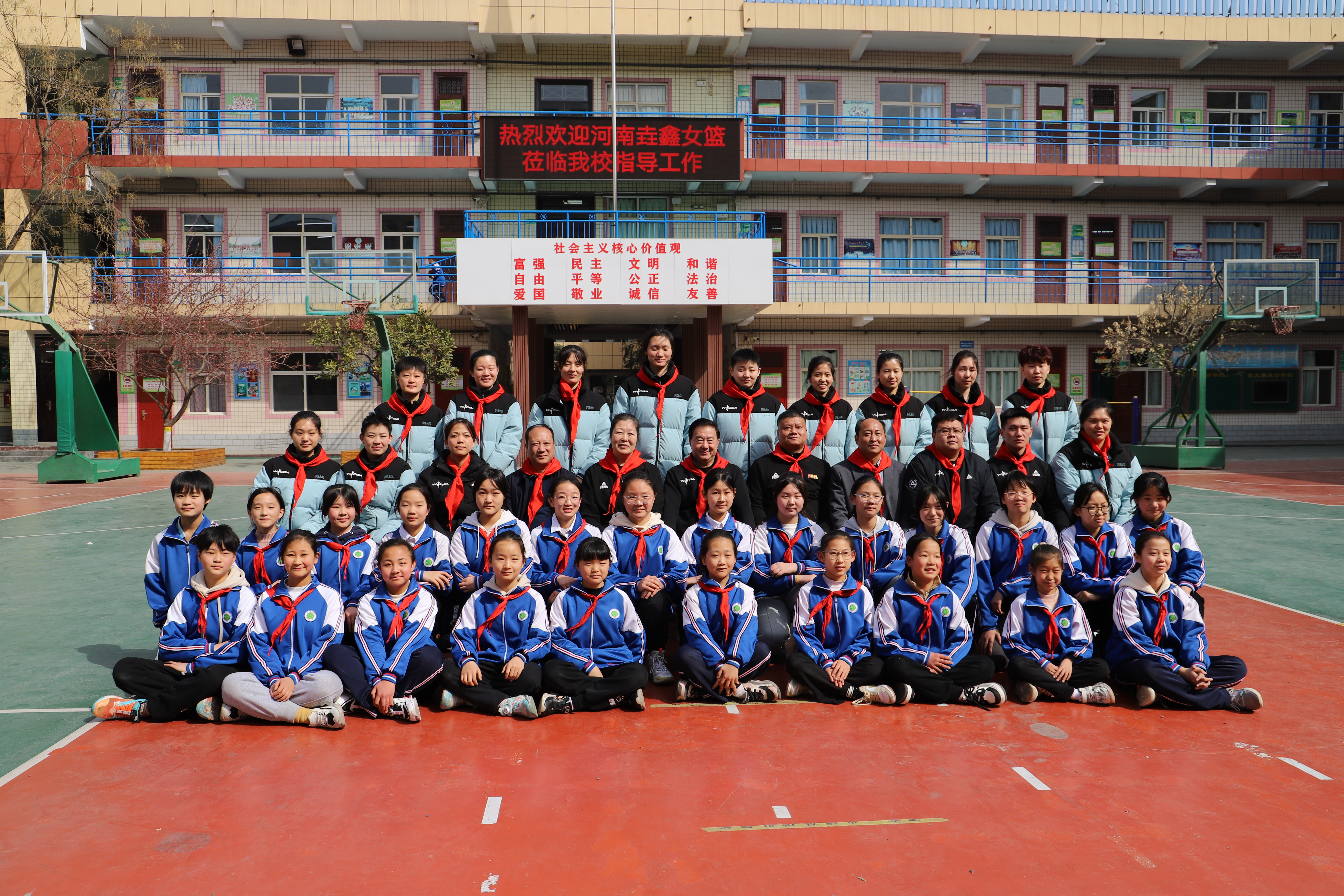 3月11日上午10时,济源市东园学校迎来了河南女篮进行篮球教学指导工作。学校大门口18名礼仪学生为前来参观的领导和河南省教练、队员佩戴红领巾。