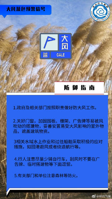 郑州市气象台2021年10月03日19时30分发布大风蓝色预警信号:预计未来24小时内,郑州市区、巩义、登封、荥阳、新密、新郑、中牟、航空港区将出现5级左右偏北风,阵风7到8级。请注意防范。.
