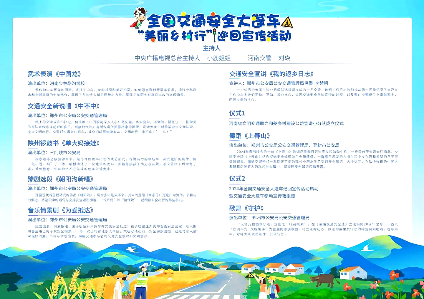 “大妈您一定一定要听劝,以后骑车要戴上头盔稳且慢,咱平平安安回家去,幸福安康乐无边……”在2024年全国交通安全大篷车“美丽乡村行”巡回宣传活动郑州站,三门峡编排的陕州锣鼓书《单大妈接娃》,赢得如潮掌声。