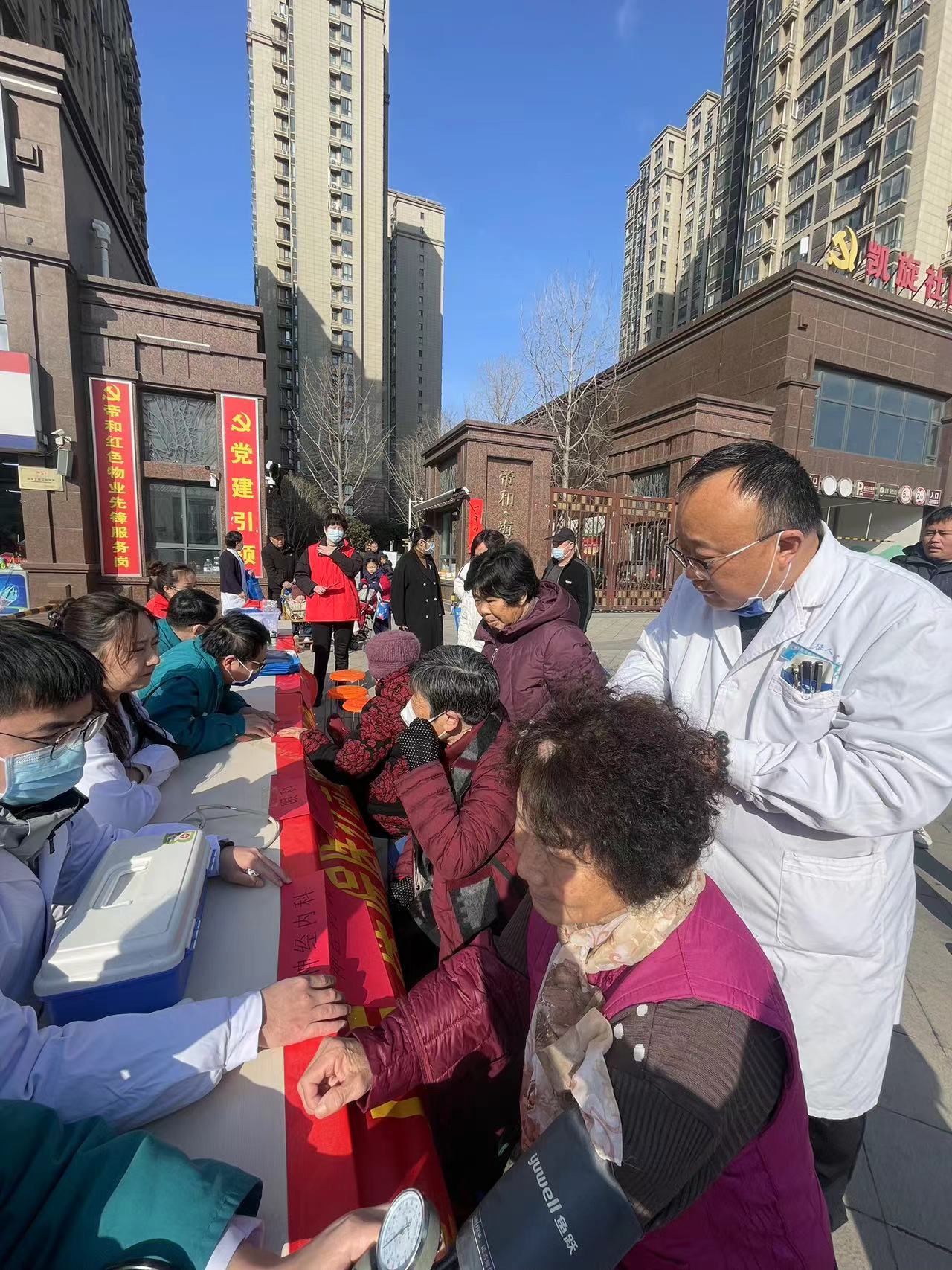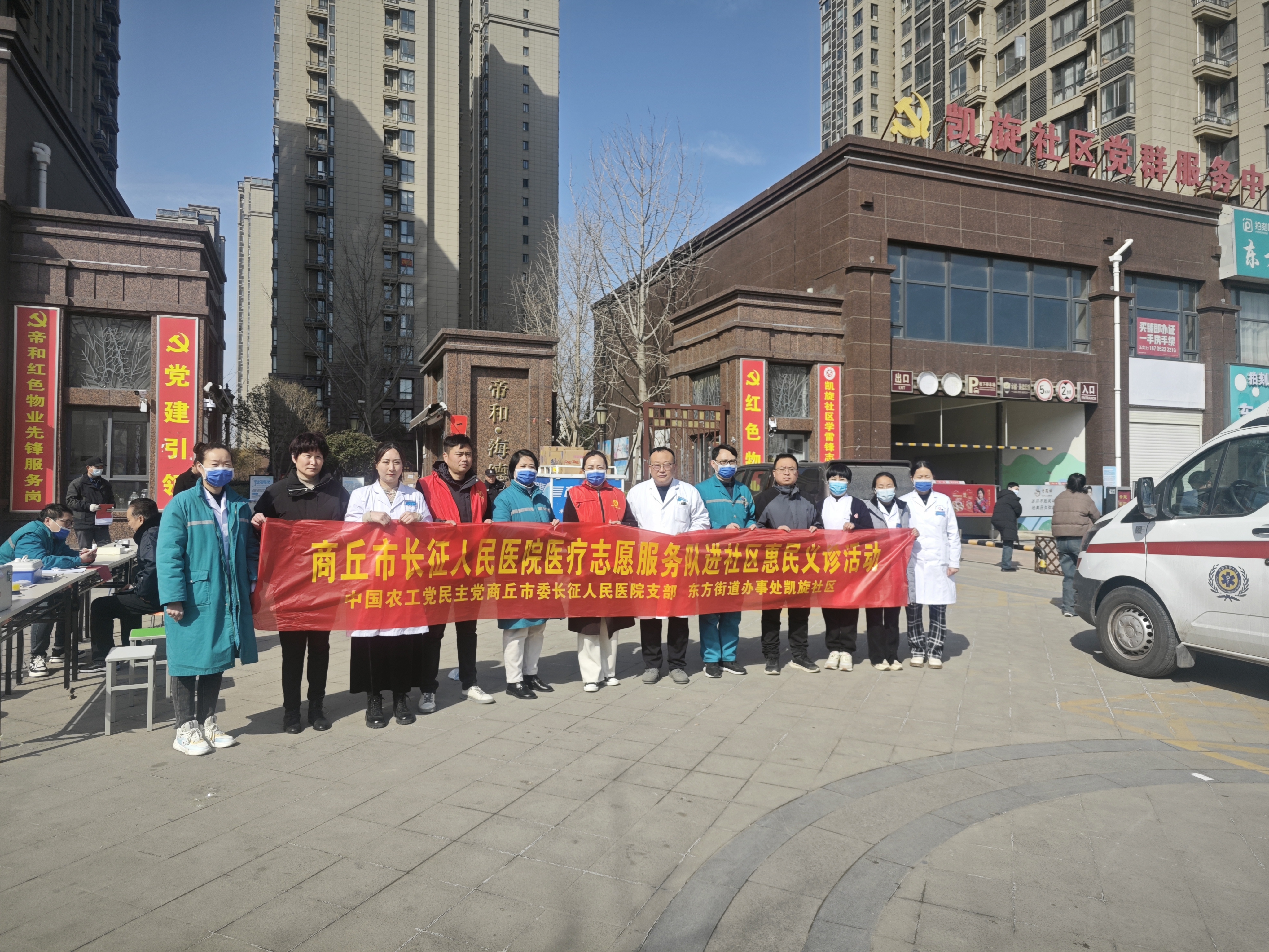 3 月 9 日,农工党商丘市委长征支部联合商丘市长征人民医院急诊科医疗队、体检科和商丘市睢阳区东方街道办事处凯旋社区,在海德公馆小区举行了义诊送温暖活动。此次义诊活动规模盛大,涉及消化内科、呼吸内科、眼科、妇科、乳腺科、普外科、骨科、心内科、神经内科、心理科、口腔科和检验科等十余个科室,为居民提供了全面的健康检查服务。