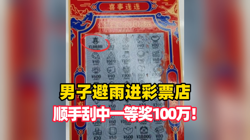 • 天降福气!男子避雨进彩票店顺手刮中一等奖100万元