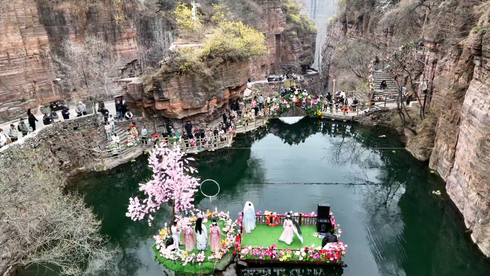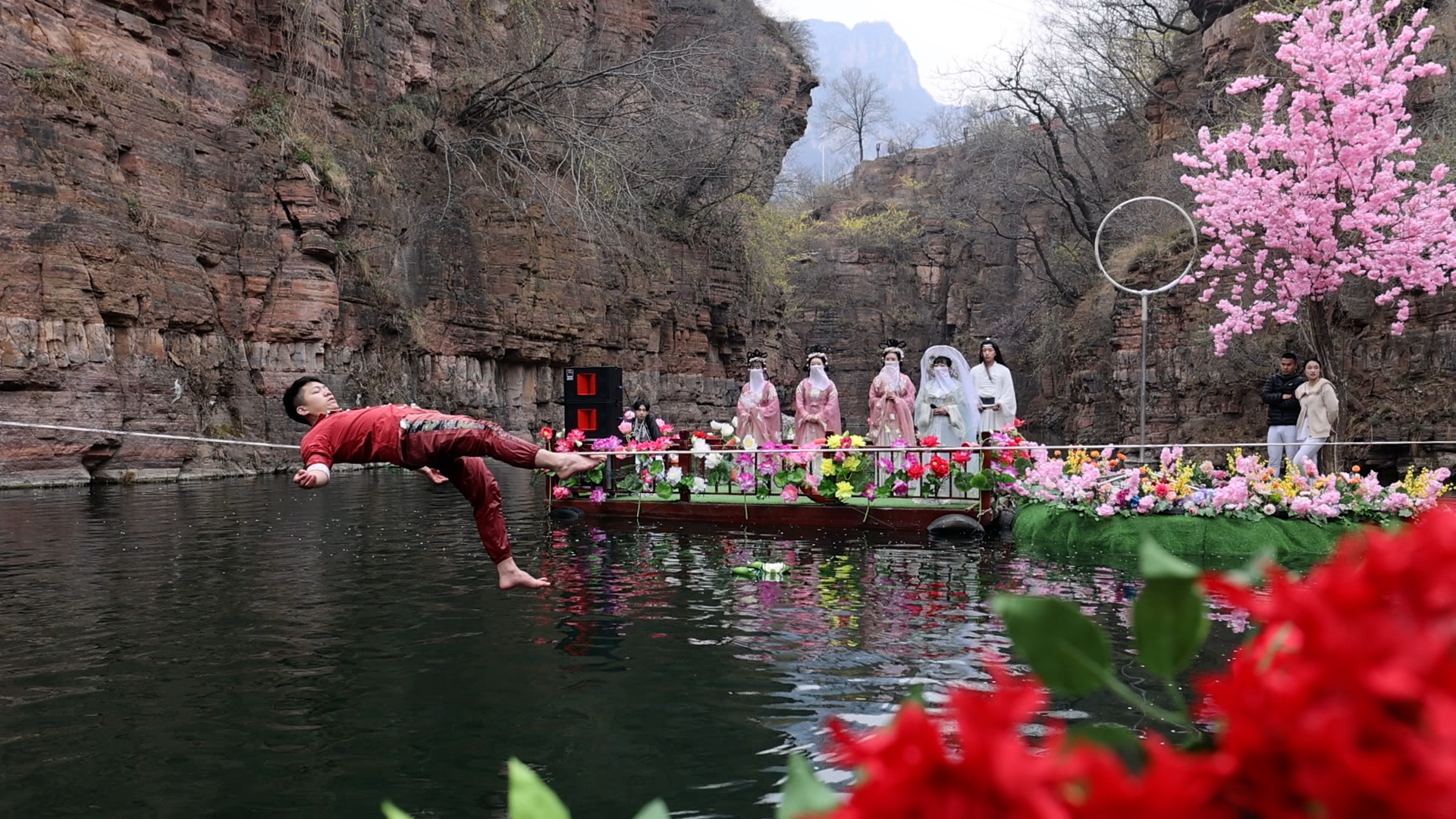 走进南太行万仙山景区,伴随着凉爽的春风,五彩斑斓的花船穿梭在碧波荡漾的天池之上,与周围的青山绿水相映成趣,构成了一幅美丽的春日画卷。水面上,杂技演员踩在柔韧的丝带上,做出一个个惊险刺激的动作,引起游客们阵阵惊呼。